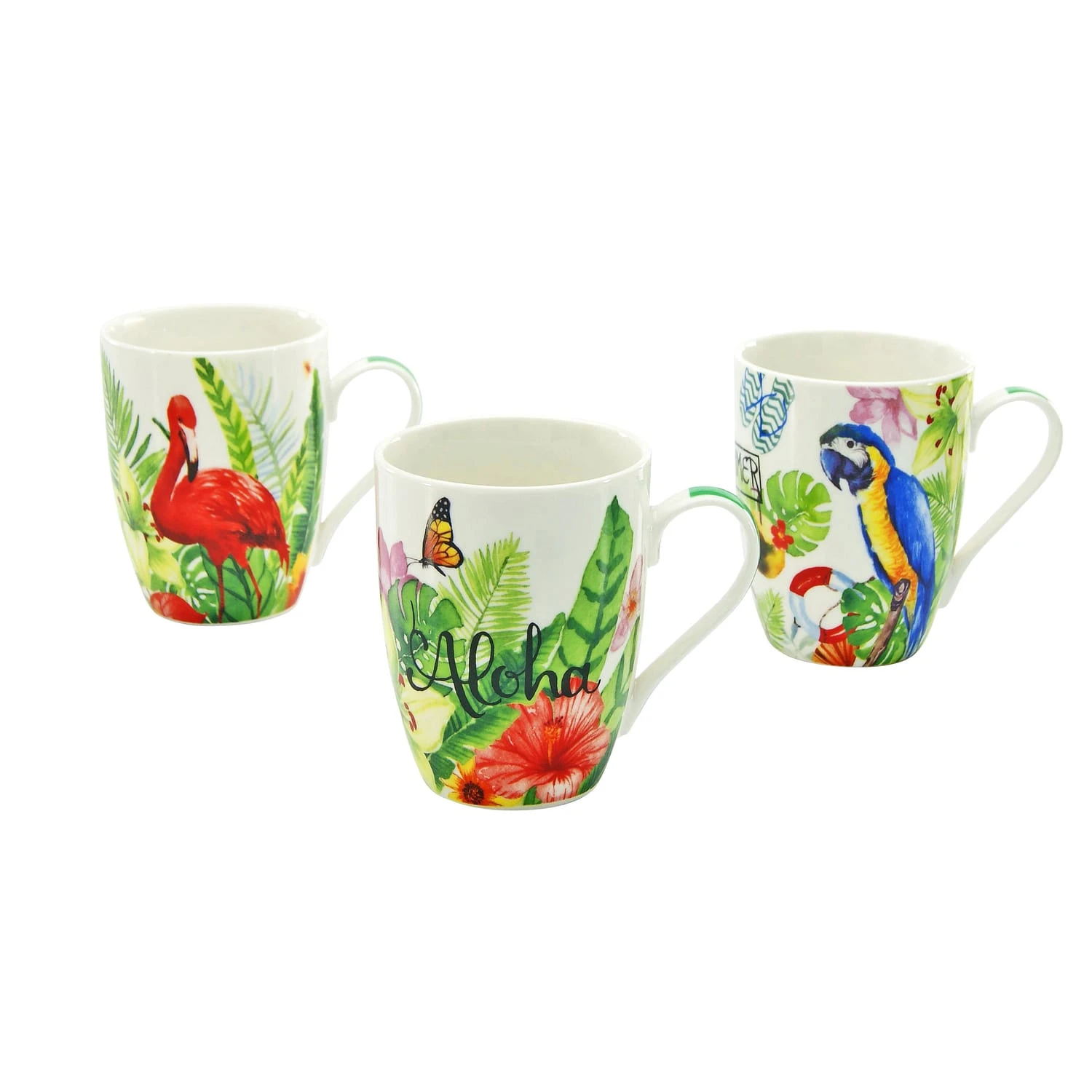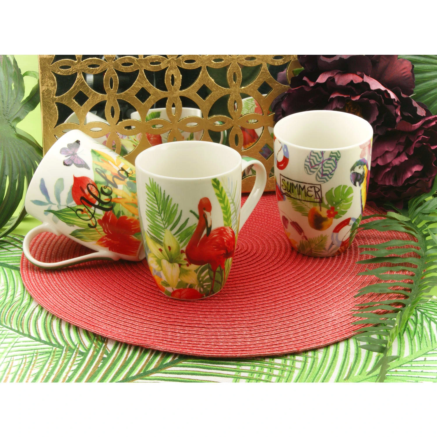 – Sie erhalten ein 6 er Kaffeebecher Set aus hochwertigem Qualitätsporzellan in 3 Motiven: 2 x 2 tropische Vögel und 2 x 1 tropisches Blattmotiv.