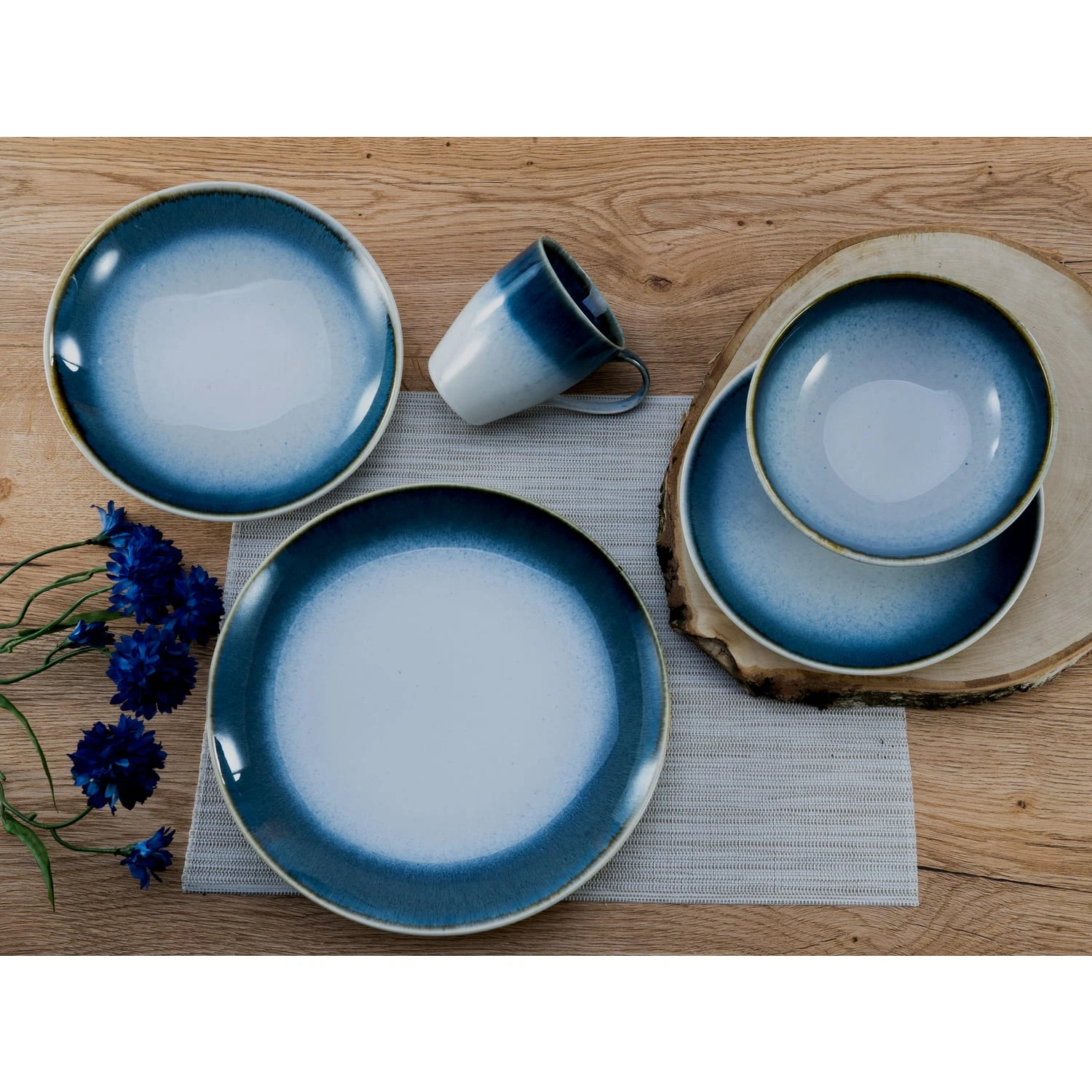 Das Geschirr präsentiert sich mit einer strahlend weißen Glasur, wobei die Kanten mit einer reaktiven farbigen Glasur bearbeitet wurden, hier in einem verlaufendem Blau.