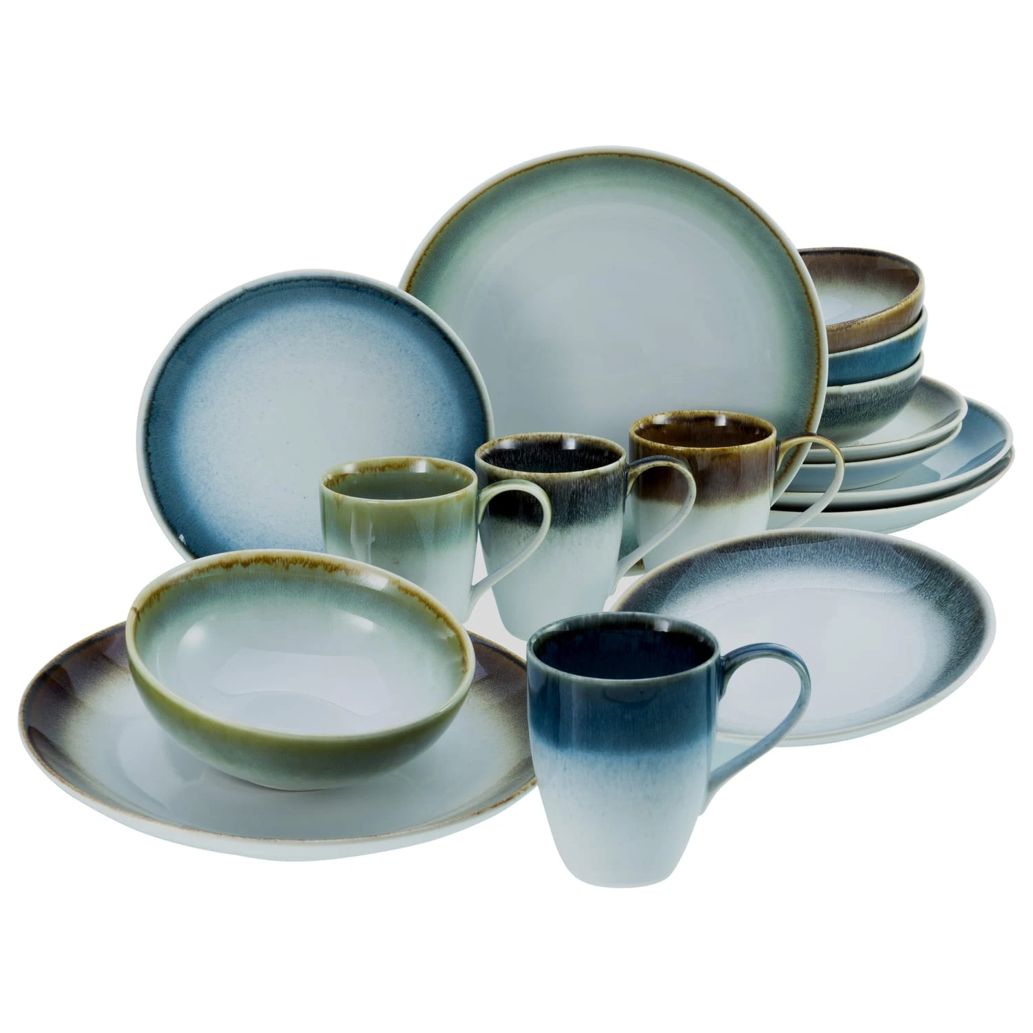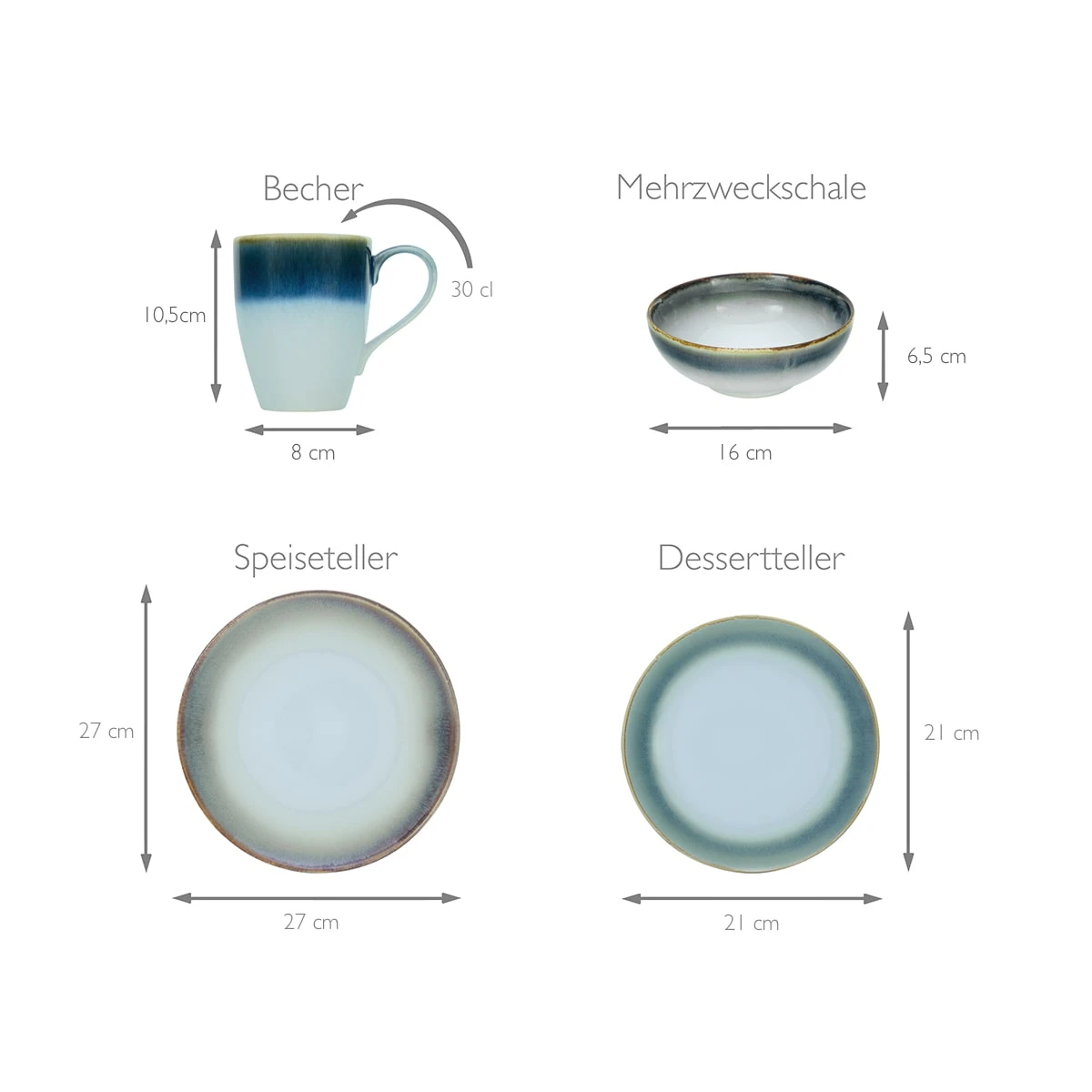 Das Set präsentiert sich mit einer interessanten Spezialglasur in den Farben Blau, Grün, Braun und Grau. An den jeweiligen Kantenentsteht eine farbige Spezialglasur, unregelmäßig und organisch verlaufend.