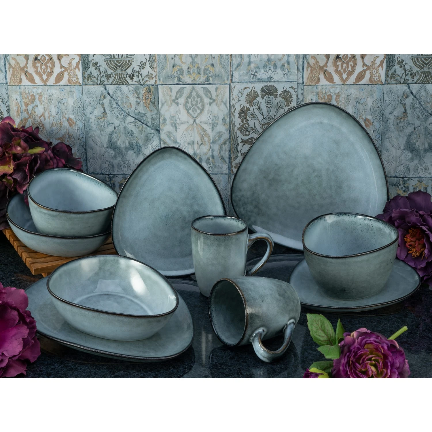 Das schöne Geschirr präsentiert sich in einer modernen, organischen und unregelmäßigen Form mit einer leichten wolkigen Glasur, lieferbar in 3 farbigen Reaktivglasuren Smokeblue, Offwhite oder Sand, hier Smokeblue!