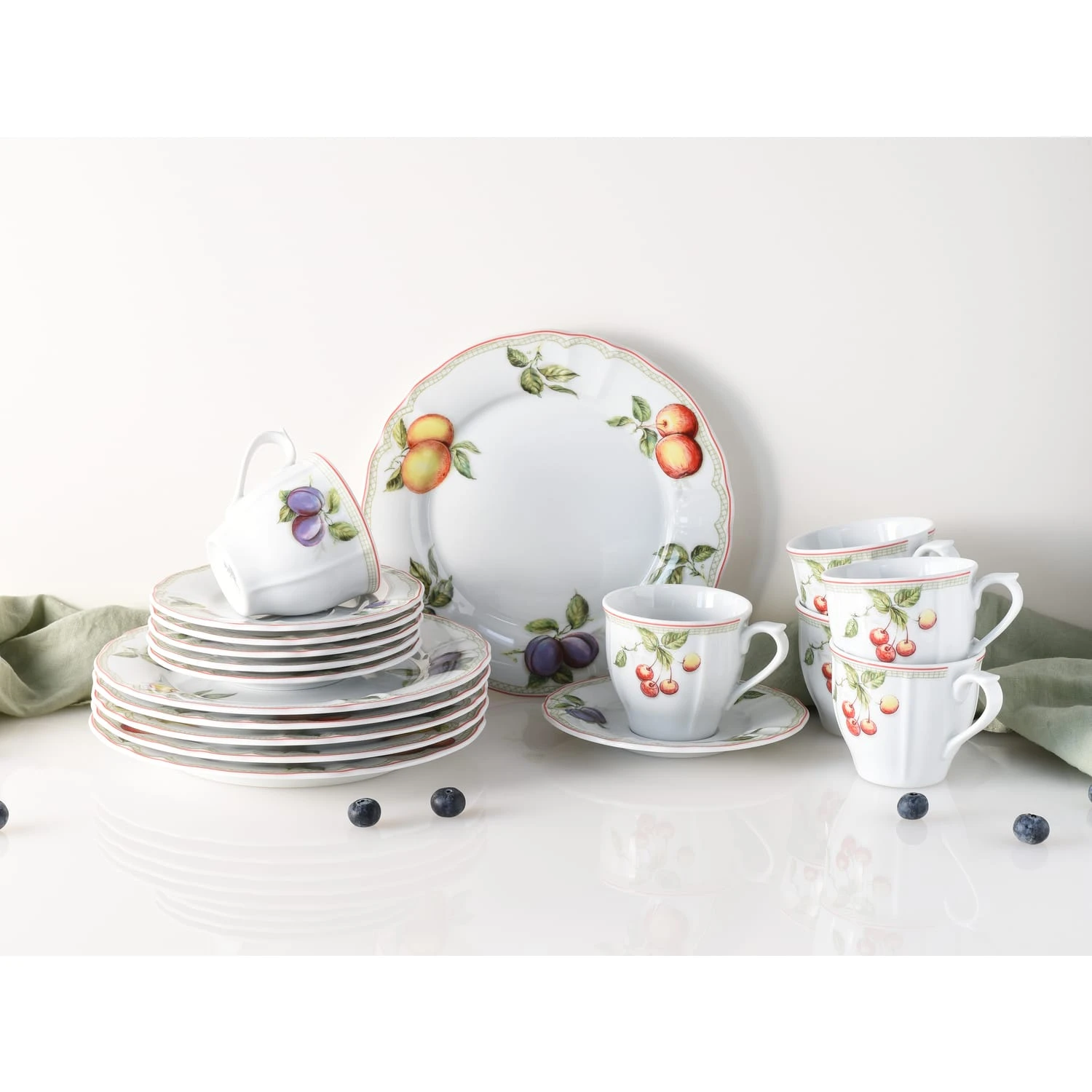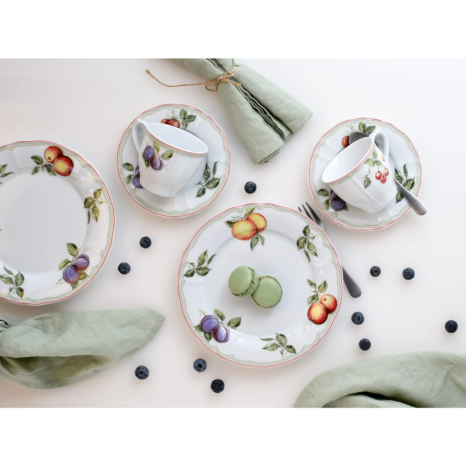 Der fein gearbeitete Obstdekor kombiniert mit einer dezenten Karogitterkante ist der Mittelpunkt einer jeden Tafel.