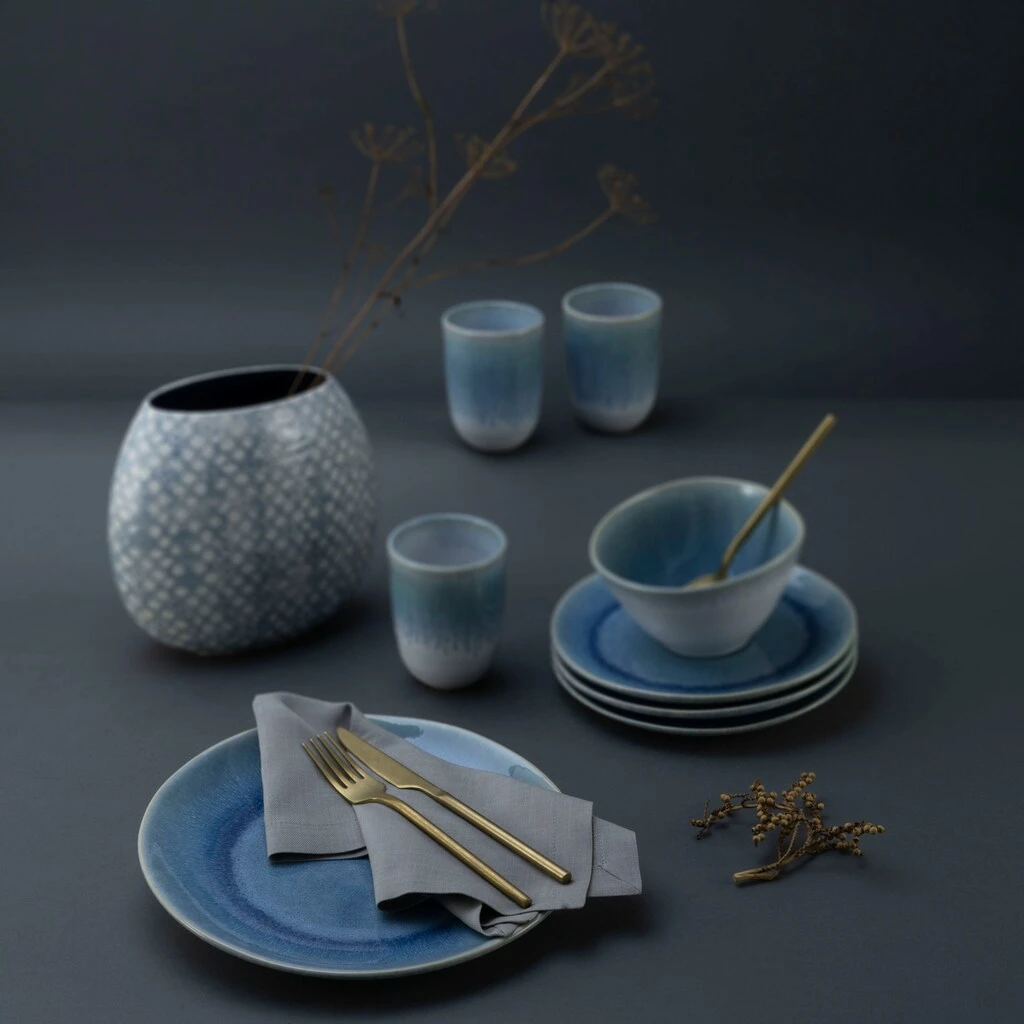 Hochwertige Reaktivglasur in Wasserblau, d.h. jedes Stück ist ein Unikat. Auffällig ist zudem der handwerkliche Look des Geschirrs, insbesondere die Becher ohne Henkel liegen „satt“ in der Hand.