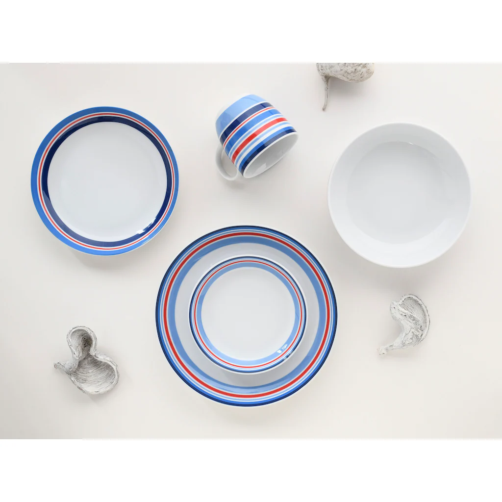 CreaTable Kombiservice COAST Line. Das Prozellan für Alle, jedes Gericht und jeden Anlass. Die tiefen Teller bieten alle Optionen und sind ein Wunder an Multifunktionalität. Die Bowls und Riesenbecher runden das Geschirr stimmig ab – mehr braucht es nicht! Das Geschirr in moderner Formsprache und unkompliziertem Bänderdekor erinnert mal wieder an Meer, Chillen, Relaxen – einfach ein moderner Lifestyle