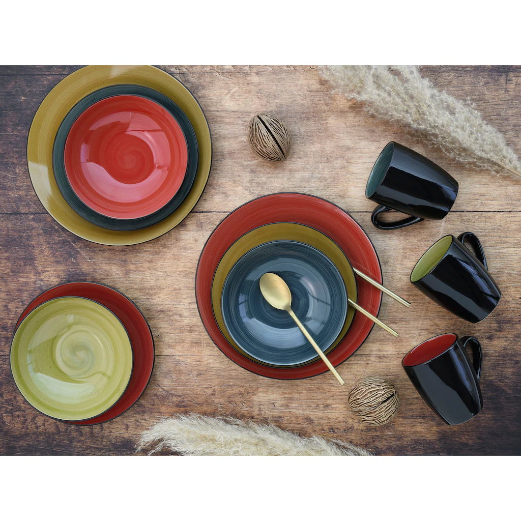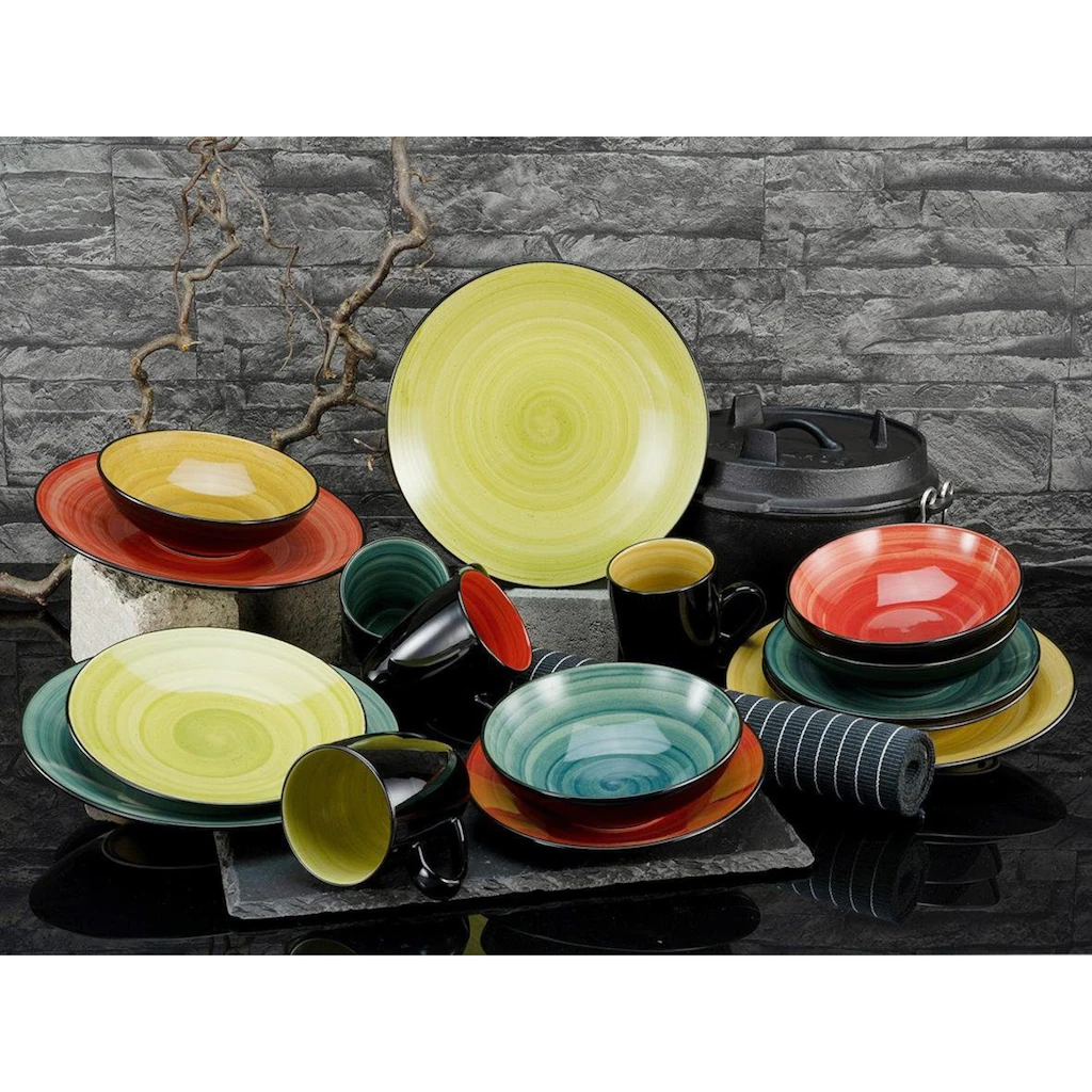 Suchst du ein Geschirr in einzigartiger Optik und toller Qualität. Dann liegst du mit dem Kombiservice SAMOA aus dem Hause CreaTable genau richtig. Das Geschirr besticht durch seine moderne Coupeform. Innen- und Oberseite der Teller sind mit einem handgemaltem, großen Spiral-Dekor versehen. Aussen und die Unterseite der Teller sind in einem Tiefschwarz. Zudem kannst du die Geschirr-Teile in deiner Spülmaschine und Mikrowelle verwenden.