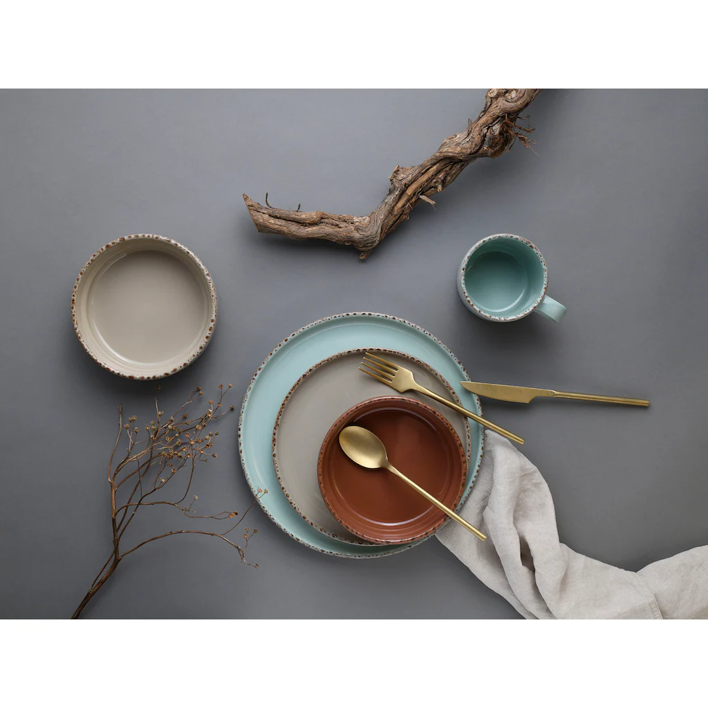 In moderner, skandinavischer Form präsentiert sich die Geschirr-Serie Terra Collection aus dem Hause CreaTable. Das aus europäischer Produktion hergestellt Kombiservice aus hochwertigem Steingut besteht aus 4 Naturfarben mit einer glänzenden Glasur. Alle Teile sind mit einem handgemaltem, nostalgischem Vintage Rand versehen. Eine einzigartige Optik!