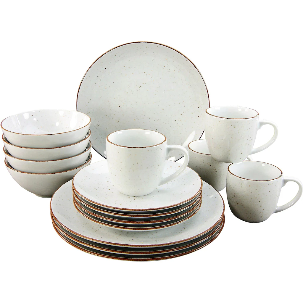 CreaTable Kombiservice »VINTAGE NATURE« aus hochwertigem Porzellan, Made in Europe. Dieses, von Hand bemalte Ess-Service überzeugt im rustikalen Landhausstil. Für die besondere Optik sorgen die gesprenkelte Oberfläche und das rustikale Aussenband. Spülmaschinenfest und mikrowellengeeignet. Das 16-teilige Kombi-Set »Vintage Nature« für 4 Personen aus dem Hause CreaTable besteht aus: 4 Gourmetteller Ø 28 cm. 4 Dessert/Salatteller Ø 21. 4 Mehrzweckschalen Ø 17 cm. 4 Kaffeebecher 32 cl.