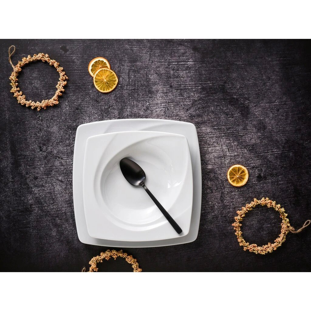 Das moderne Porzellan »Celebration« in weißer Farbe verwandelt jeden Esstisch in eine elegante Tafel. Das stilvolle Geschirr in quadratischer Form und mit elegantem Relief setzt harmonische Akzente an jedem Tisch. Da es in uni-weißer Farbgebung gehalten ist, fügt es sich mühelos in das Wohnambiente ein und lässt sich wunderbar mit anderen Farben kombinieren. Alle Teile sind spülmaschinenfest und für die Mikrowelle geeignet. Ein besonders hübsches Porzellan in außergewöhnlichem Design ist die elegante Serie »Celebration«.