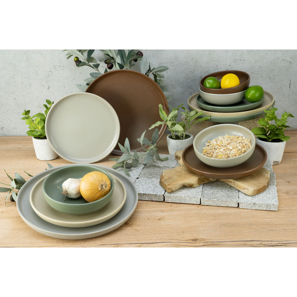 Uno Natural – ein Geschirr aus dem Hause CreaTable in weicher Formsprache mit handwerklicher Optik. Die Farben Grün, Terra, Stein und Sand sind aktuell angesagte, natürliche Töne in seidenmatter Spezialglasur. Ein Geschirr passend zum europäischem Life Style – individuell, unkompliziert und vielseitig. Zudem ist das Geschirr für deine Spülmaschine und Mikrowelle geeignet