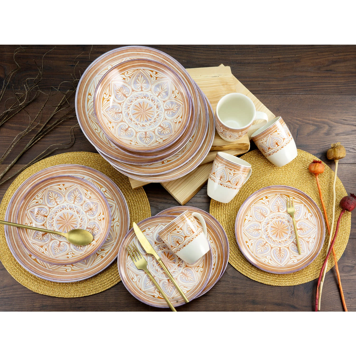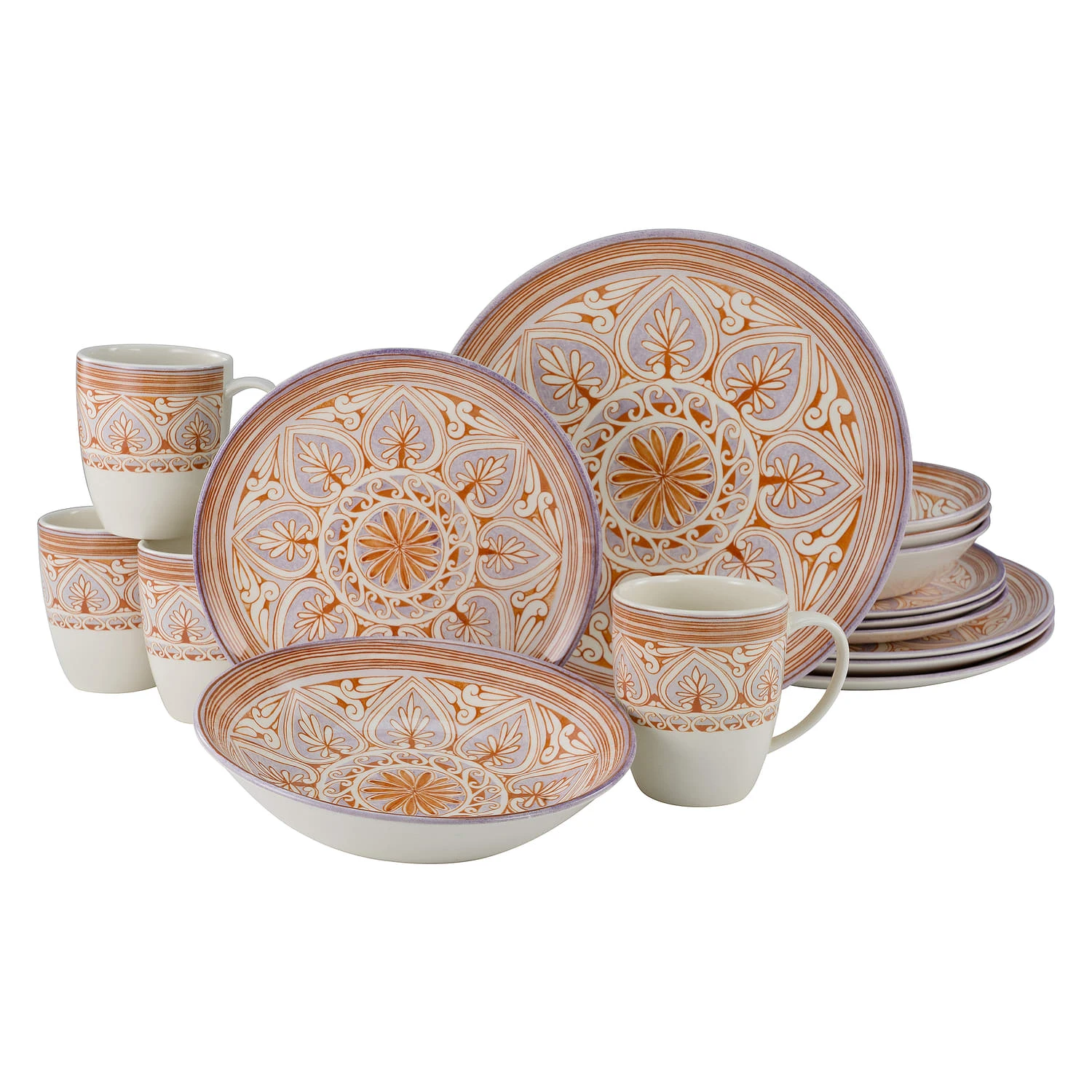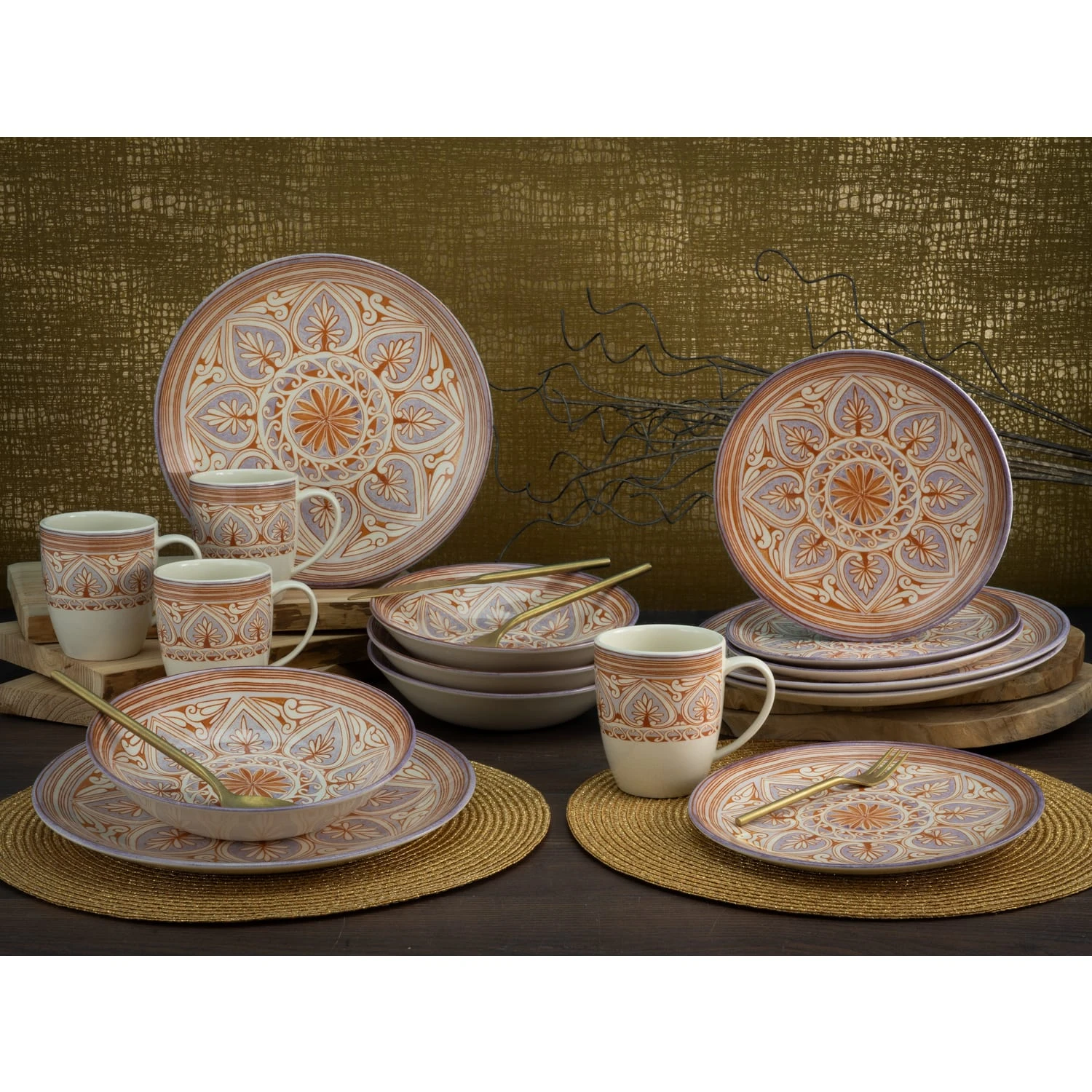 Das Geschirr präsentiert sich mit traditionellen keramischen Fliesenmotiven. Bei diesen fein gearbeiteten Motiven spürt man den mediterranen, orientalischen Flair mit dem Farbakzent Rostrot.